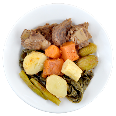 Corte as carnes e escalde. Na panela coloque as carnes e os temperos batidos no liquidificador com água. Deixe cozinhar. Quando estiver amolecendo a carne, colocar uma boa quantidade de água quente e as verduras para cozinhar.